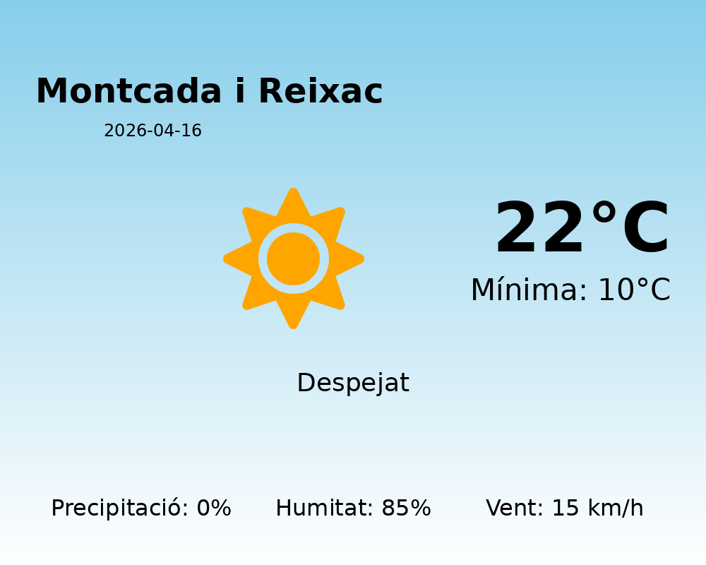 Bon dia a tota la població de Montcada i Reixac! Avui, 16 d’abril de 2026, es presenta com un dia amb condicions meteorològiques agradables i sense precipitacions.