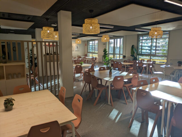 Pel que fa a l’espai físic, s’ha iniciat la renovació arquitectònica d’onze menjadors amb actuacions que han inclòs millores en la insonorització, redistribucioms de l’espai, canvis de pintura per apostar pels tons càlids, il·luminació LED, nou mobiliari adaptat, panells fonoabsorbents i estructures que afavoreixen autonomia i regulació emocional.