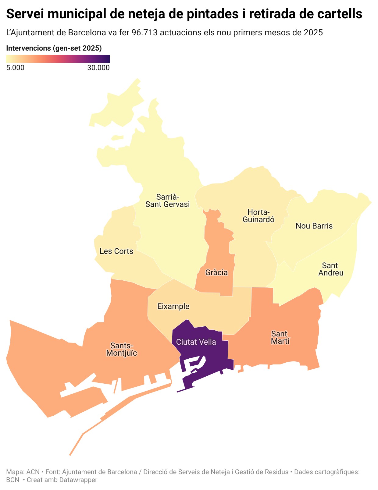 L’any passat, en el mateix període analitzat, Ciutat Vella va concentrar el 28% de totes les intervencions del servei municipal, gairebé 27.000 en nou mesos. Sumades a les 11.695 de Sant Martí (12%), i les 10.952 del districte de Gràcia (11,3%), representen més de la meitat de les actuacions de neteja de pintades, i retirada de cartells i pancartes de la ciutat.