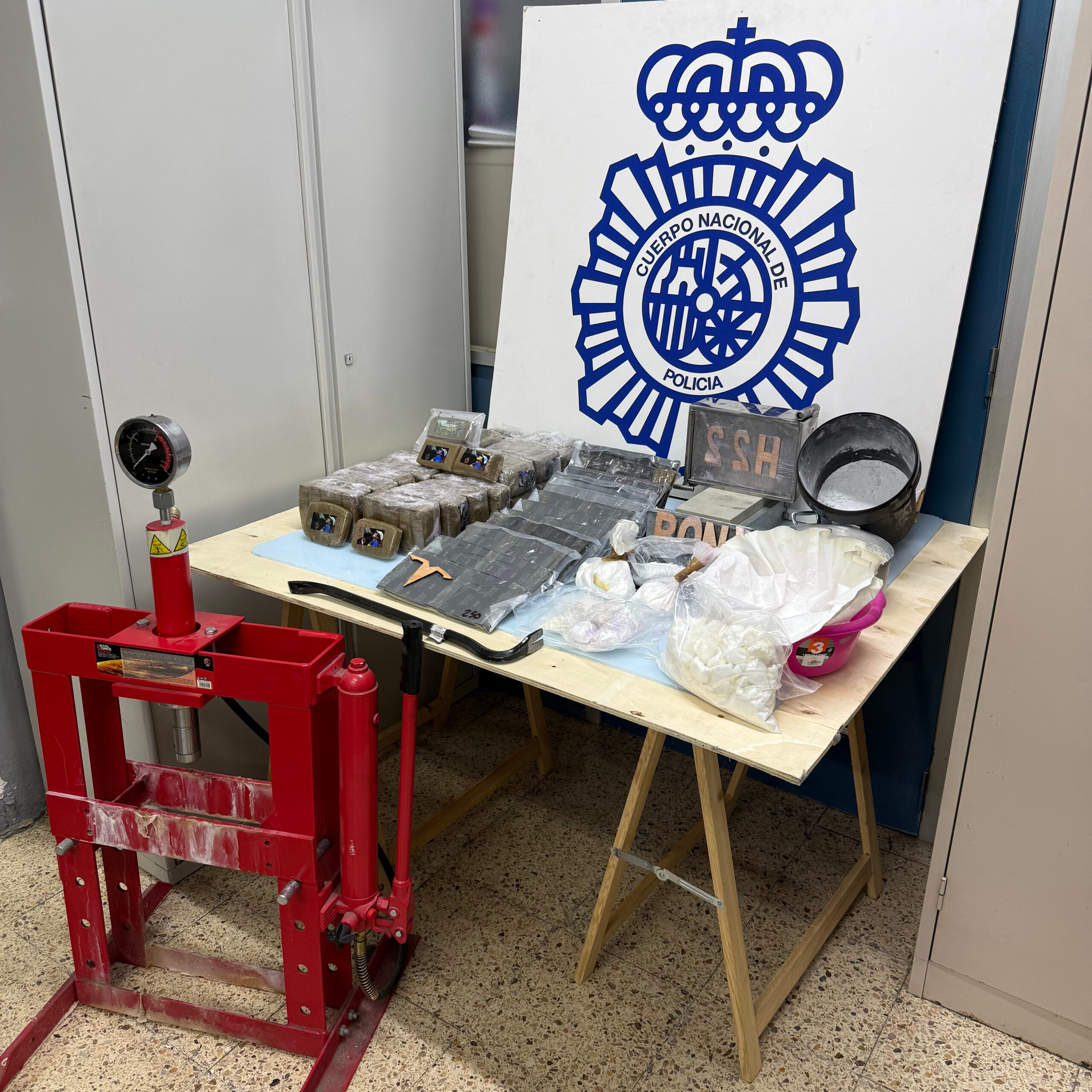 També es van trobar segells utilitzats normalment per identificar l”autor’ de la cocaïna, a més de grans quantitats de substància de tall, utilitzada per disminuir la puresa de la cocaïna, aconseguir més quantitat de substància i, per tant, augmentar els beneficis en la venda d’aquesta, cosa que suposa un risc més gran per a la salut pública. També es va intervenir una premsa hidràulica i multitud de motlles utilitzats per empaquetar i premsar la droga després d’haver estat processada.