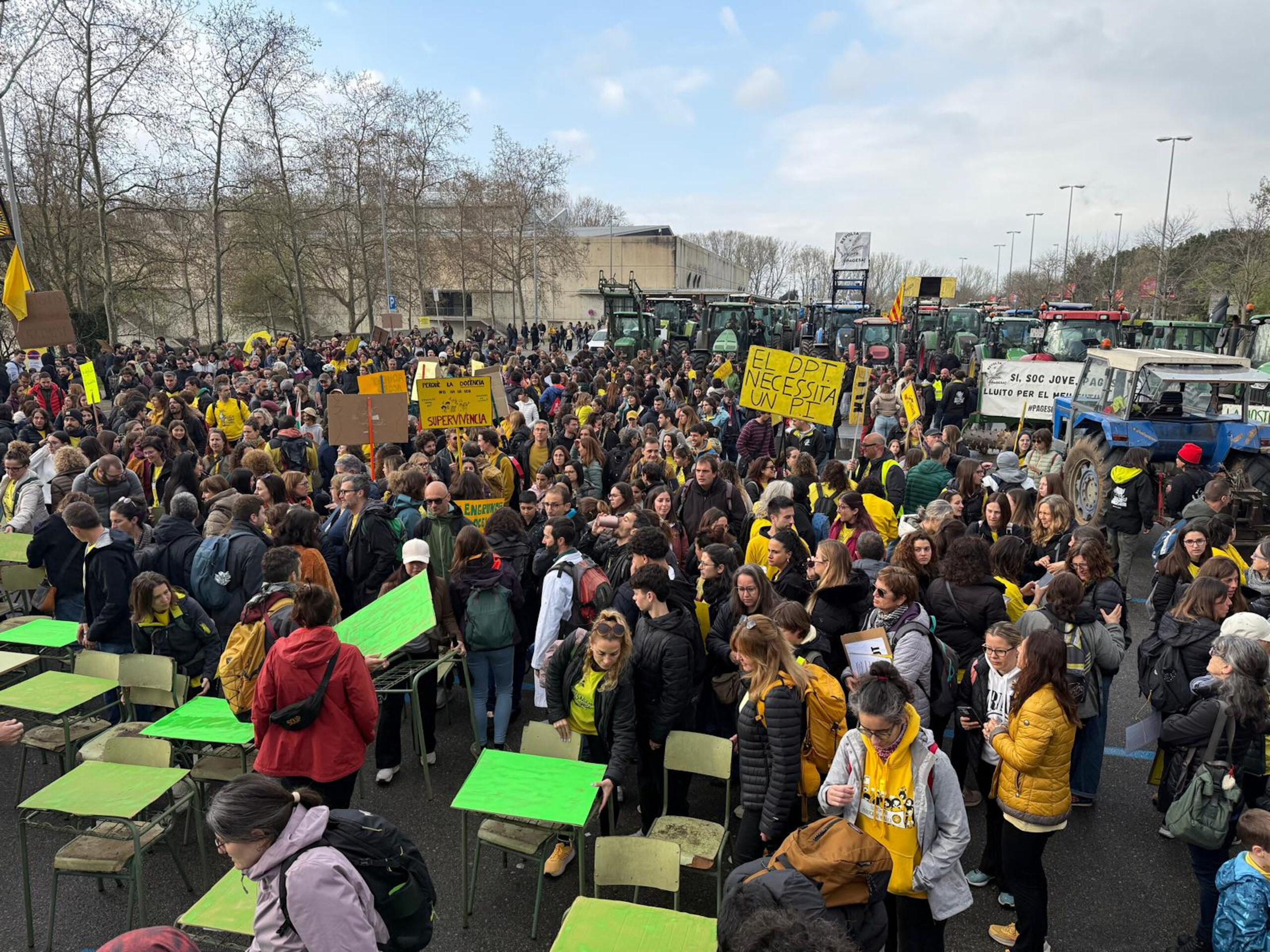 D’altra banda, unes 700 persones, acompanyades d’una quarantena de tractors de Revolta Pagesa, s’han concentrat a Girona, davant del pavelló de Fontajau. Els manifestants, docents i pagesos, han simulat una classe, amb pupitres i una pissarra.