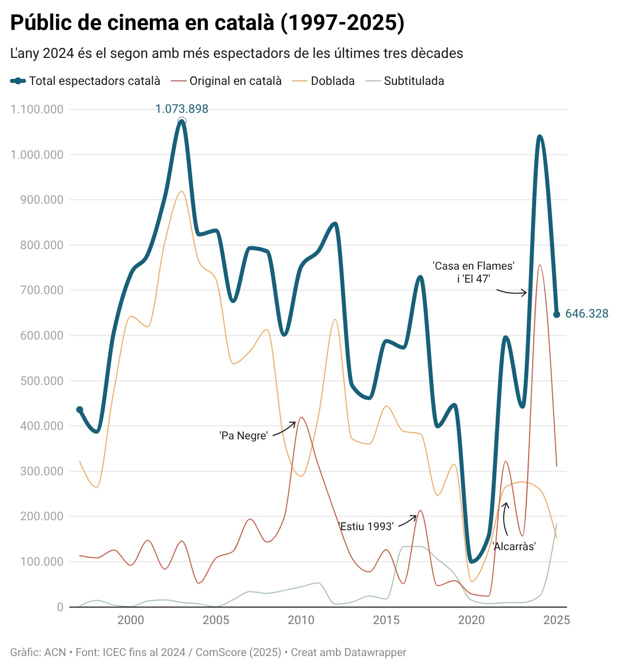 ACN Barcelona – El català va assolir l’any passat la segona millor xifra de la història als cinemes del país en nombre d’espectadors respecte al total, amb un 5,47% de quota, segons dades de ComScore facilitades per l’Institut Català d’Empreses Culturals (ICEC) a l’ACN. En les tres últimes dècades, només s’ha superat el llindar del 5% en tres ocasions, inclòs el 2025, que es queda, però, lluny del rècord del 2024, amb un 7,84%. Films com ara ‘Casa en Flames’, el més vist en català aquell any al país, o bé el també exitós ‘El 47’, va trobar continuïtat l’any passat amb ‘Wolfgang’. Amb tot, el total d’entrades venudes a projeccions en VO catalana, doblada o bé subtitulada en aquest idioma no va arribar a les 700.000, cosa que contrasta amb el milió del 2024.