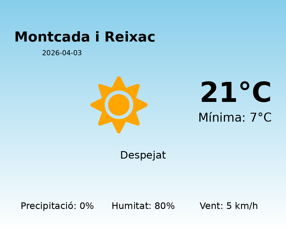 Bon dia a tothom! Avui, 3 d’abril de 2026, Montcada i Reixac experimentarà un clima primaveral suau i agradable. Les temperatures oscil·laran entre una màxima de 21°C i una mínima de 7°C. Sens dubte, és un bon dia per gaudir a l’aire lliure!
