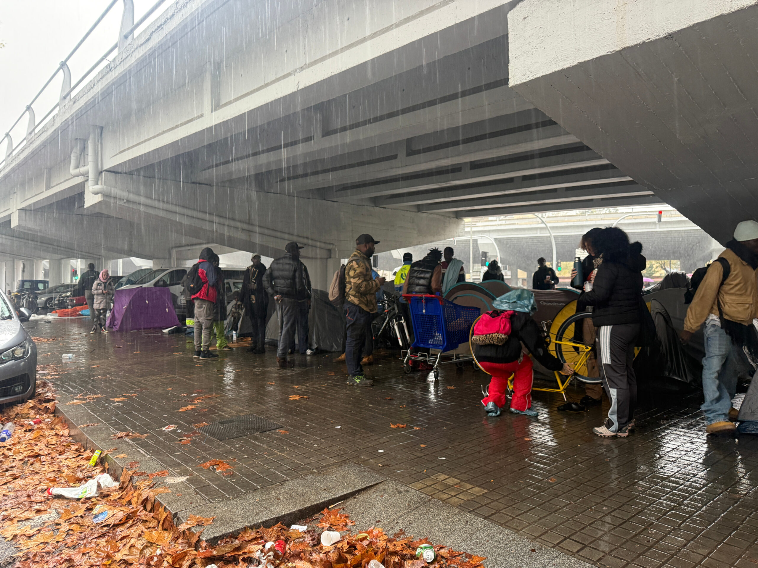En aquest punt a sota de l’autopista, hi ha desenes de tendes instal·lades, on els desallotjats s’han refugiat durant la nit i aquest dissabte al matí hi continuen, resguardats de la pluja. Després del desallotjament de l’antic institut B9 aquest dimecres a primera hora del matí, aquesta ha estat la tercera nit que els desallotjats l’han passat al ras. “Estem treballant perquè la normalitat torni a la zona i la normativa no permet l’acampada a la ciutat”, ha volgut deixar clar Albiol, que ha respost directament a les crítiques de “racisme institucional” i manca de suport als desallotjats del B9. “El que ha de fer l’ajuntament és donar un habitatge o pagar una pensió a 400 persones que ocupaven il·legalment un immoble? És això?”, s’ha preguntat en veu alta l’alcalde de Badalona.