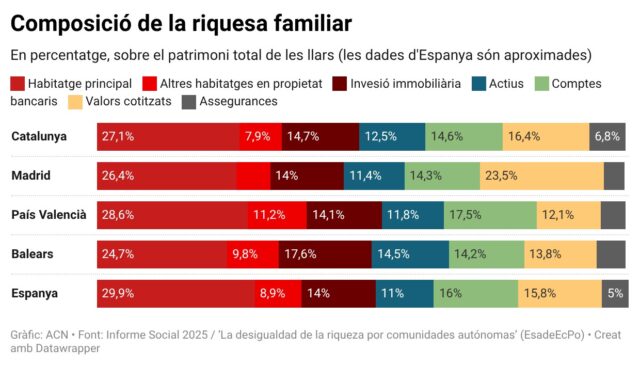 Segons remarca l’Informe, l’habitatge habitual “esdevé l’element central” del patrimoni de les classes mitjanes, mentre que a partir del 10 % de població més rica guanyen protagonisme els habitatges d’inversió, els actius de negoci i, sobretot, els actius financers. En els percentils més elevats, els actius financers concentren la major part de la riquesa, “cosa que permet rendibilitats més altes i una major capacitat d’acumulació”.