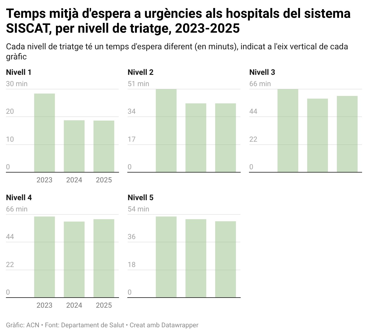 Ja al nivell 3, l’espera el 2025 va ser de 60,59 minuts, pels 58,49 minuts del 2024. L’any anterior, el 2023, el temps va ser de 65,99 minuts. Així mateix, l’espera el 2025 al nivell 4 era de 62,23 minuts, pels 60,29 minuts del 2024, i els 64,29 del 2023. Finalment, el temps del nivell 5 era de 49,59 minuts el 2025, 50,89 el 2024, i 52,63 minuts el 2023.