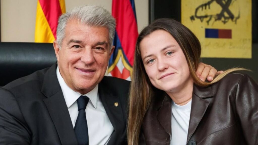 Imatge de Joan Laporta, president del FC Barcelona i Claudia Pina, jugadora del primer equip femení (via Instagram)
