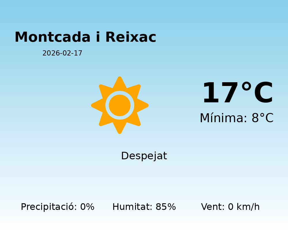 Avui, 17 de febrer de 2026, Montcada i Reixac gaudirà d’un clima relativament suau per a les dates d’hivern. La temperatura màxima que es registrarà serà de 17°C, mentre que la mínima serà de 8°C. Malgrat la frescor de la matinada, les temperatures es mantindran agradables durant el dia.