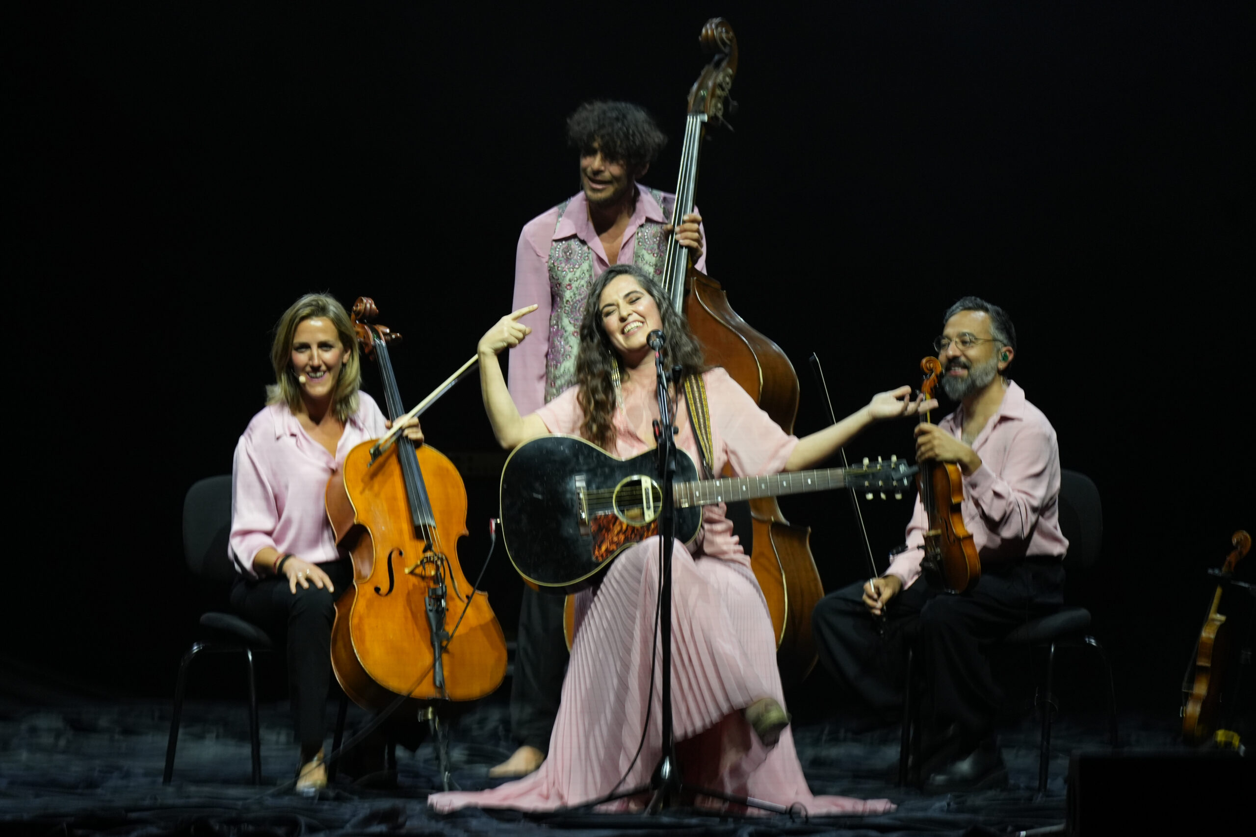 Pocs minuts després de dos quarts de nou del vespre, la cantant de Palafrugell ha aparegut a l’escenari del Liceu amb una posada escena sòbria, amb només la seva veu, amb un vestit rosa, que després ha mutat en blanc i rosa. A la segona cançó, ja ha aparegut la seva petita orquestra de corda per a interpretar el poema ‘La sed’, que forma part del nou disc. Durant el concert també ha anat traient la seva guitarra, i l’ha acompanyat instruments de vent i percussió, i un cor de 12 dones cantants.