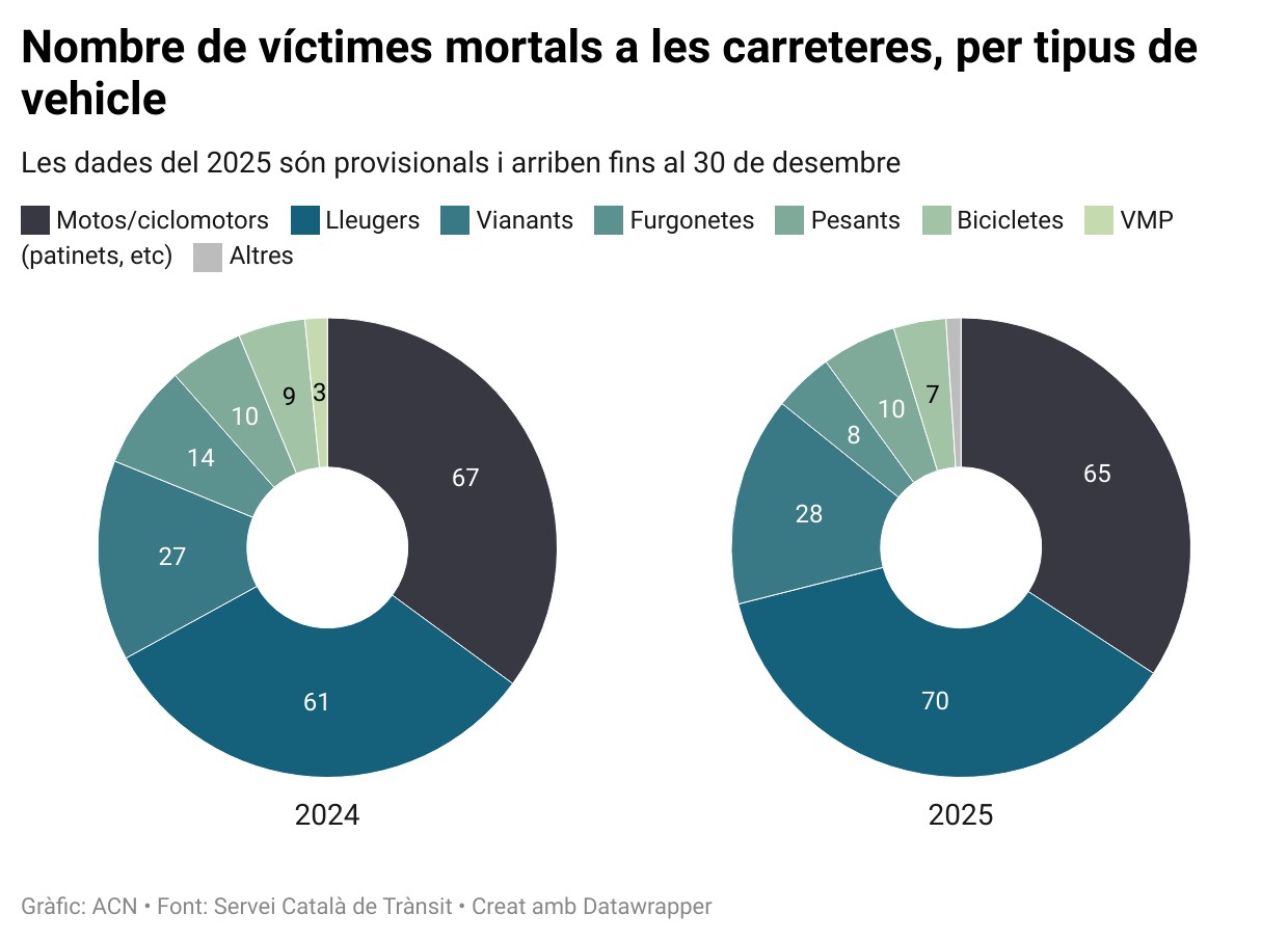 Segons dades del SCT, per tipus de vehicles, els qui han concentrat més mortalitat aquest any són els lleugers, amb 70 víctimes, seguit de les motos i ciclomotors (65), els vianants (28) i els vehicles pesants (10). Furgonetes (8), bicicletes (7) i altres vehicles (2) també han deixat pèrdues de vida a les vies del país.
